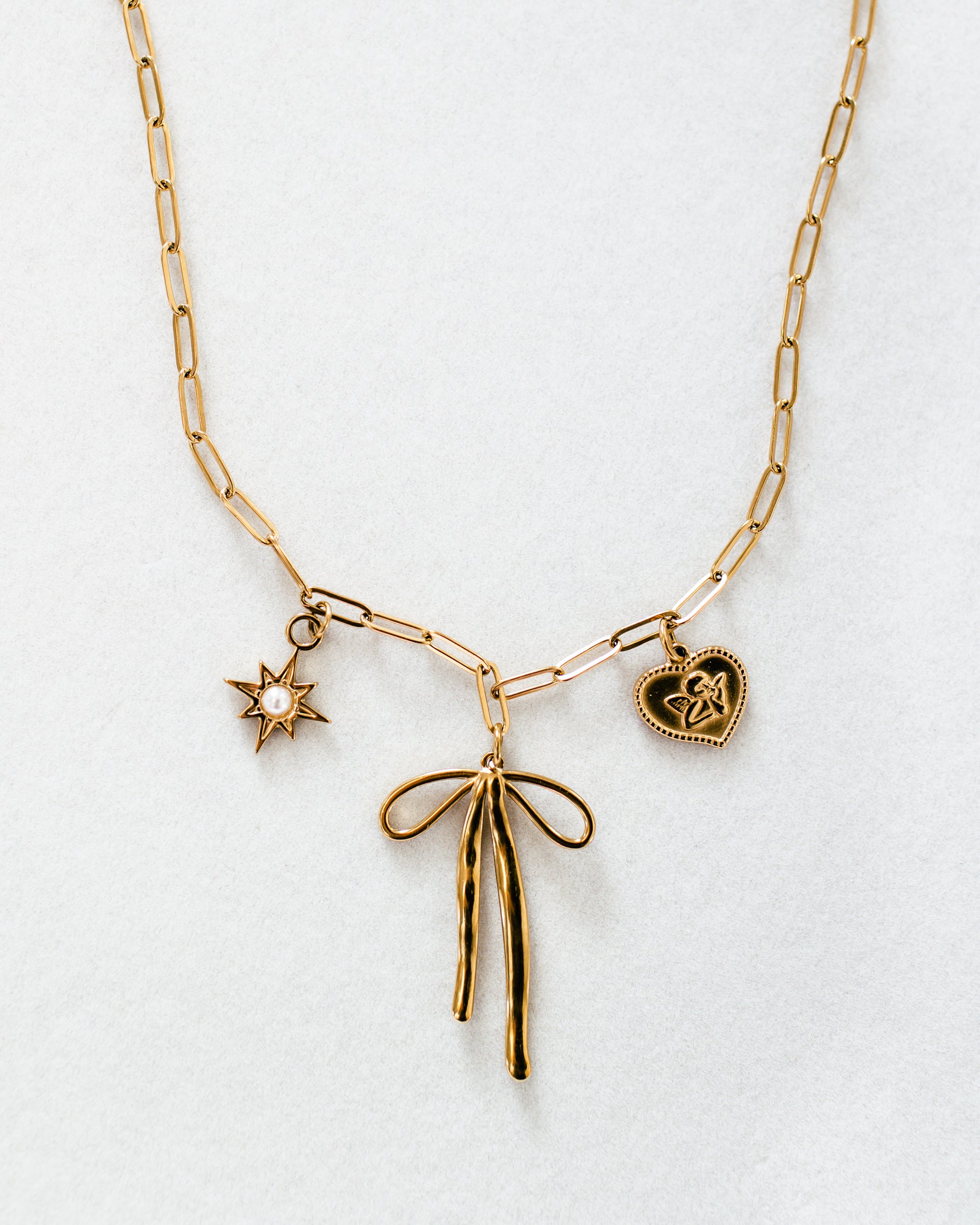 Accessorize with style and personality with our 18K Gold Plated Stainless Steel Charm Necklace. Featuring a trendy paperclip chain and three stunning charms including a cute bow, a heart with a cupid, and a star with a pearl center. Waterproof and tarnish resistant for long-lasting wear.