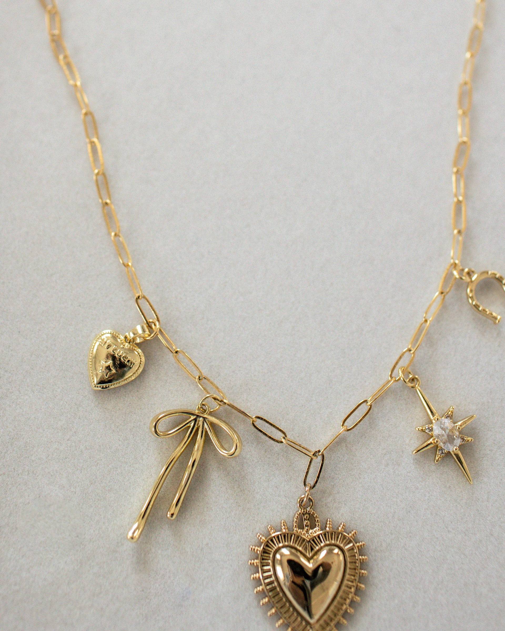 Add some heart to your style with our 18K Gold Filled charm necklace. The delicate paperclip chain adds a stylish touch to this playful piece. Perfect for expressing your love (for jewelry)! 18K Gold paperclip chain with five gold filled charms.